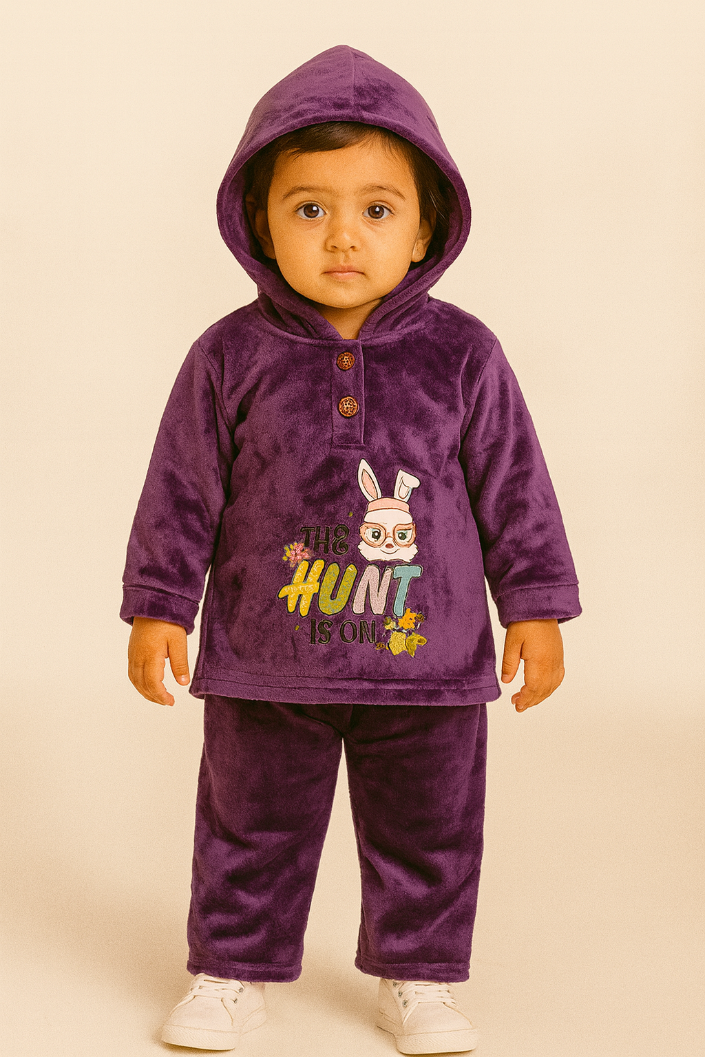 The rich purple hoodie features a playful bunny print with the text “The Hunt Is On”, adding fun and charm to your child’s look. The wooden-style buttons on the front add a stylish touch, while the cozy hood keeps extra warmth locked in.
