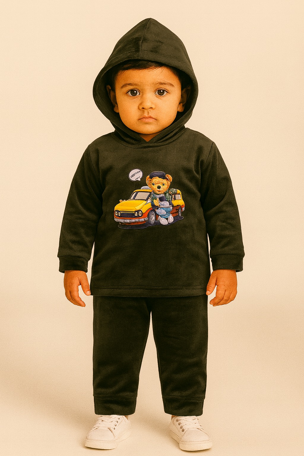 The black hoodie top features a fun and vibrant bear-with-car graphic that kids will love. The attached hood provides added warmth, making it ideal for chilly days, outings, or casual wear.