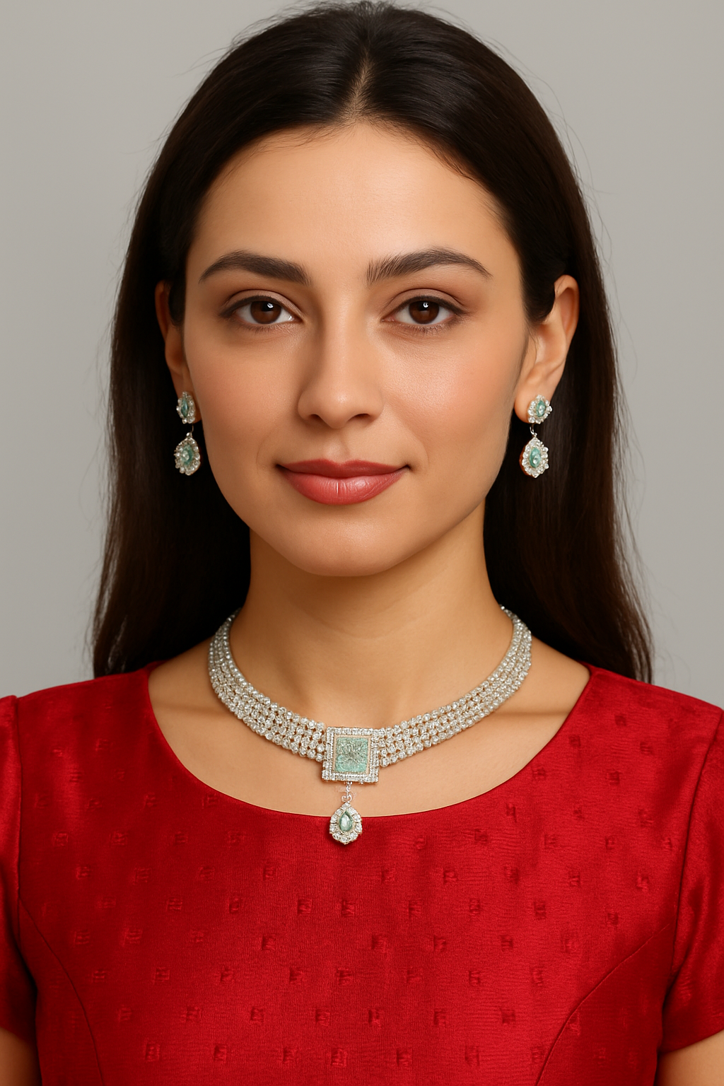 A sophisticated silver-plated choker necklace set featuring a shimmering triple-layer design, highlighted with a mint-green square pendant and matching earrings. Perfect for weddings, parties, receptions, and festive occasions. Elegant, lightweight, and premium-looking.