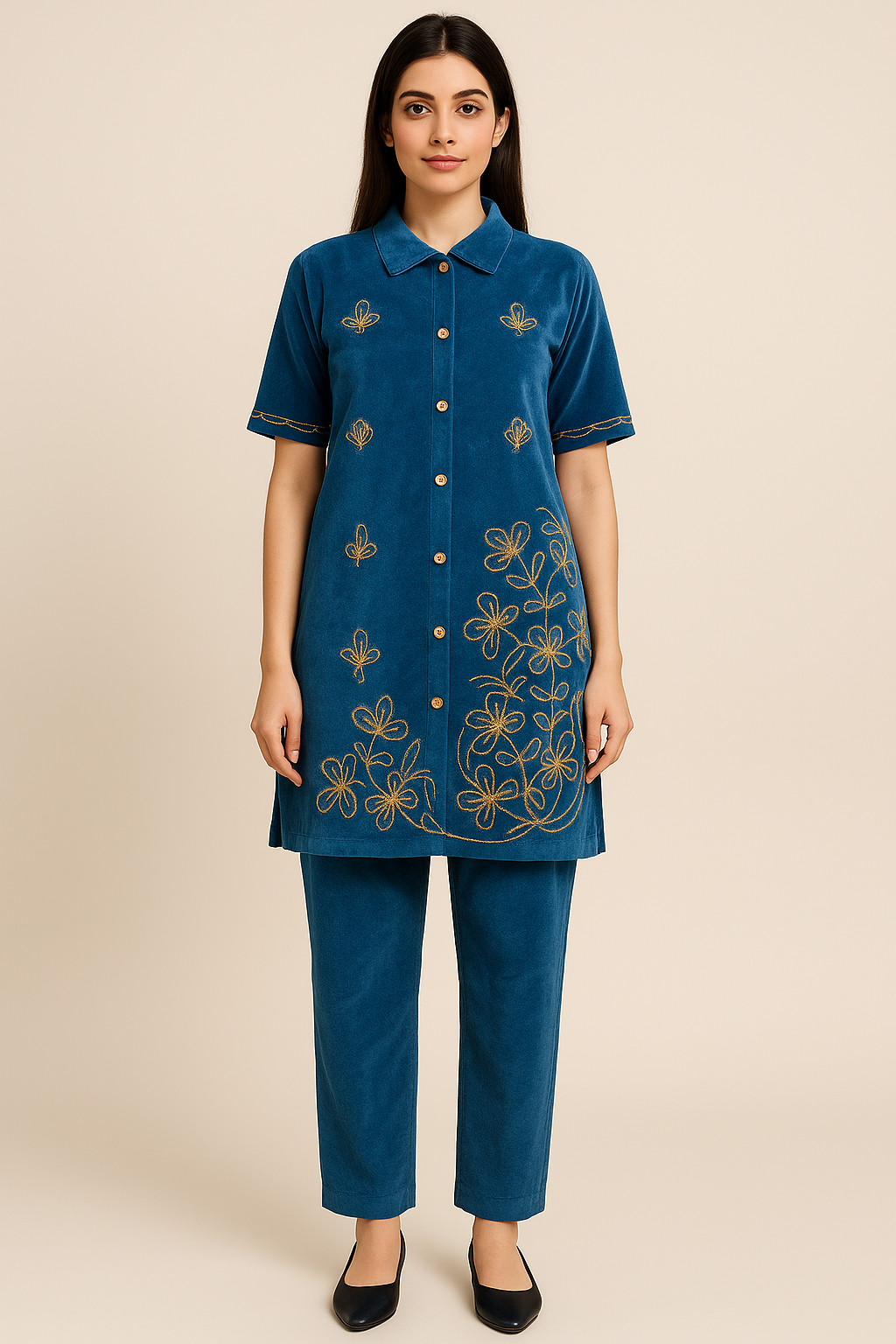 The short-buttoned kurta features a shirt-style collar, golden floral embroidery, and half sleeves, giving it a refreshing contemporary twist. Paired with matching velvet pants, this set is ideal for daily wear, festive gatherings, casual outings, or evening events.