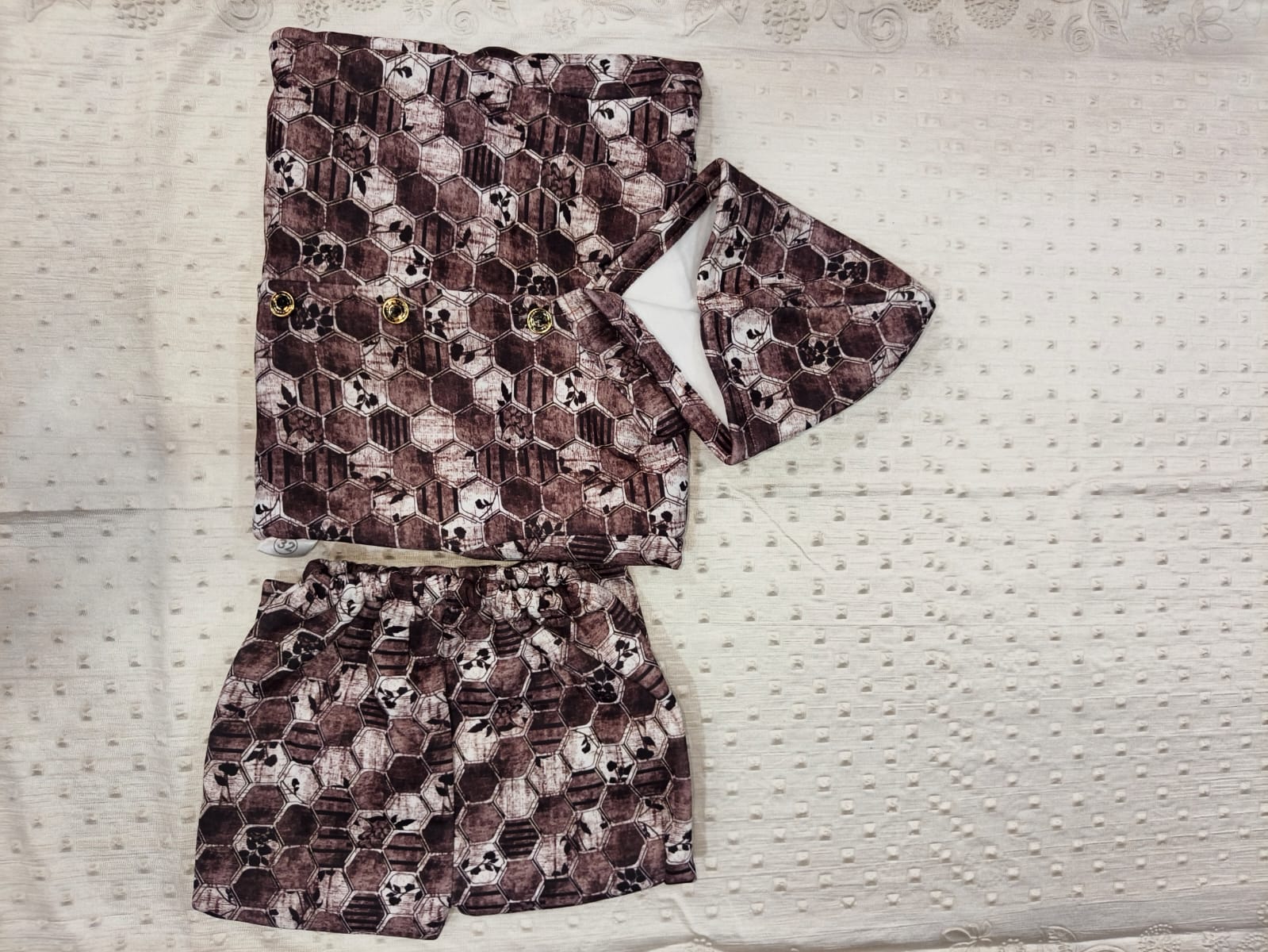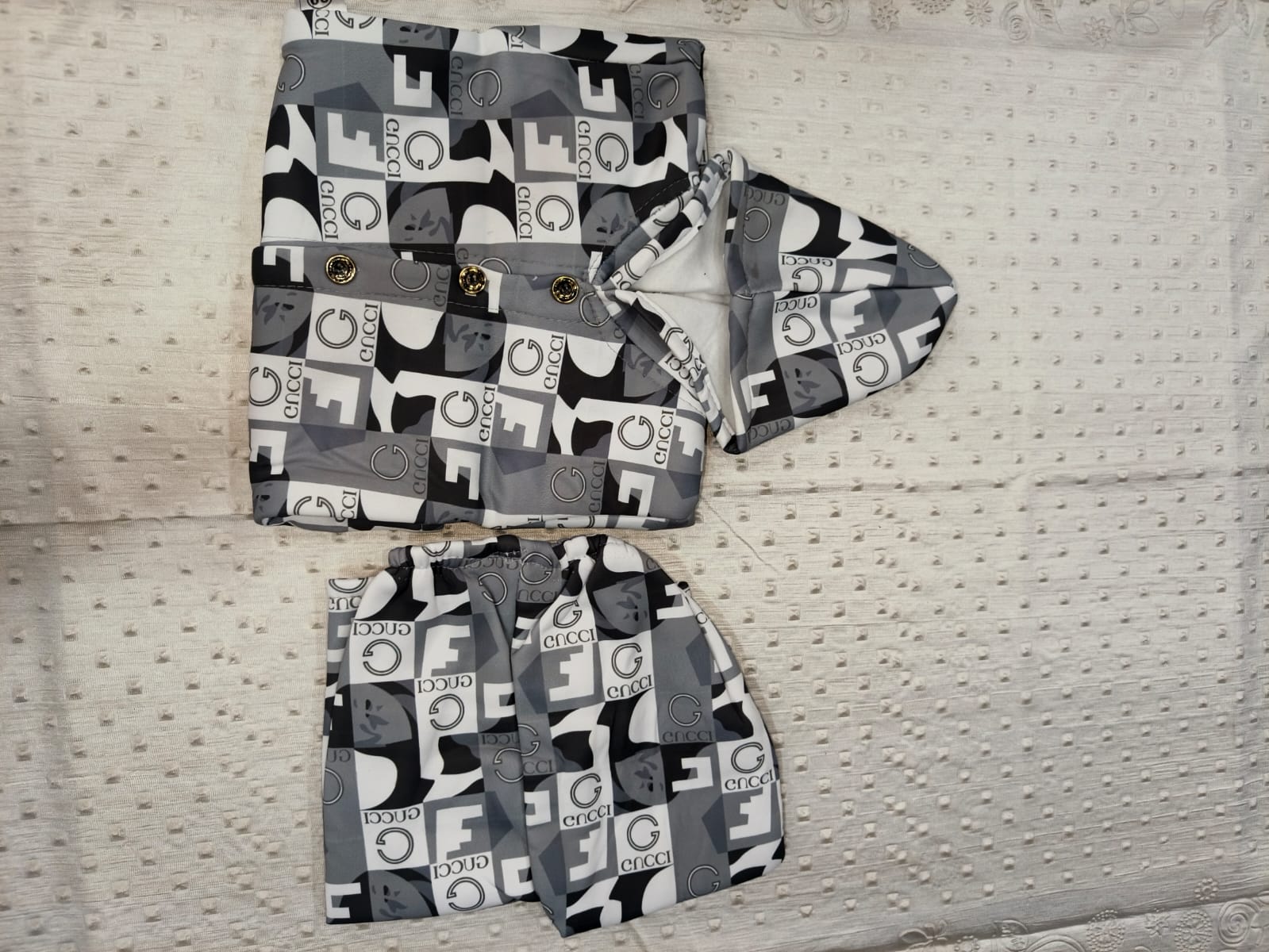 This adorable toddler boys’ hooded tracksuit set features a stylish printed sweatshirt paired with matching jogger pants for a coordinated winter look. Made from soft, breathable fabric, it keeps your child warm and comfortable throughout the day. The hooded top with button closure and flexible joggers make it easy to wear and perfect for outdoor and indoor activities. A fashionable and practical winter outfit for your little one.